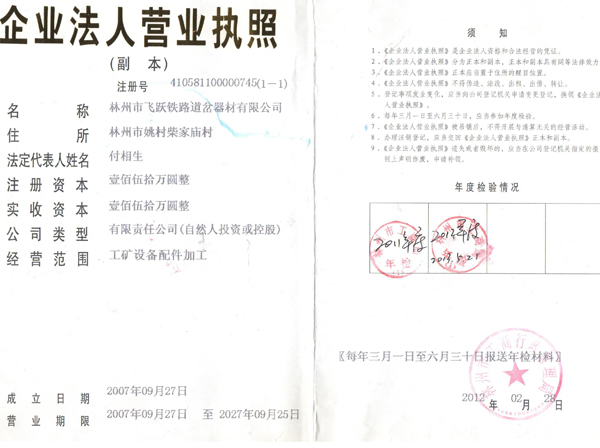 林州市飛躍鐵路道岔器材有限公司位于舉世聞名的世界八大奇跡之一“人工天河”紅旗渠畔,晉、冀、豫三省交界處,交通、通訊便捷。 公司擁有職工和管理人員120多人,高工5名,技術(shù)人員23人。擁有先進(jìn)的鑄造機(jī)加工設(shè)備和完整的質(zhì)量檢測(cè)體系,使我公司連續(xù)數(shù)年被評(píng)為“重合同守信用”和“重量管理”先進(jìn)單位。公司生產(chǎn)的主要產(chǎn)品有:輕重軌道岔及各種工具。按種類(lèi)區(qū)分有:?jiǎn)伍_(kāi)道岔、對(duì)稱(chēng)道岔、三開(kāi)道岔、渡交組合道岔等。特殊要
